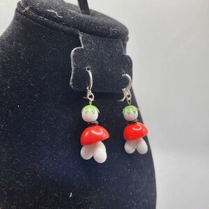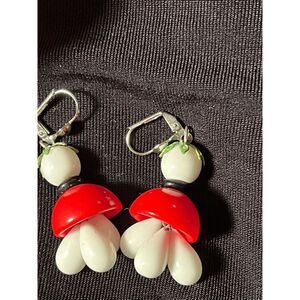 materials - sterling silver ear loops, red black and white glass and acrylic beads