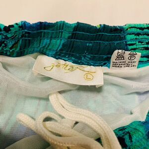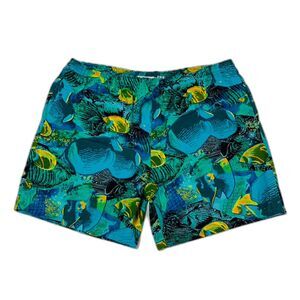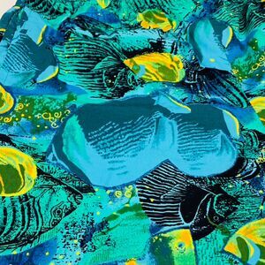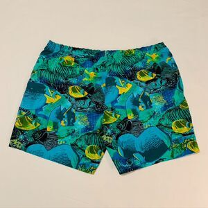 Rare true vintage 80s swim trunks, made in Korea, featuring an amazing tropical fish print in green, blue, and yellow. These shorts have that classic retro beachwear aesthetic, perfect for summer, vacations, or collectors of vintage surf/skate fashion!