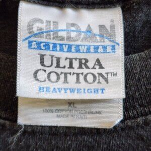 Gildan brand. Made in Haiti. 100% cotton. Well worn screen printing looks amazing.