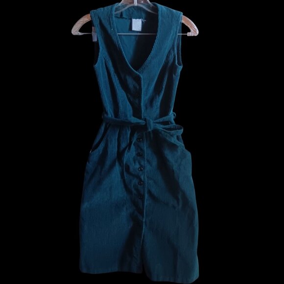 True Vintage Jumper Dress 5 1970's Boho Teal Corduroy Sleeveless Midi Belted
