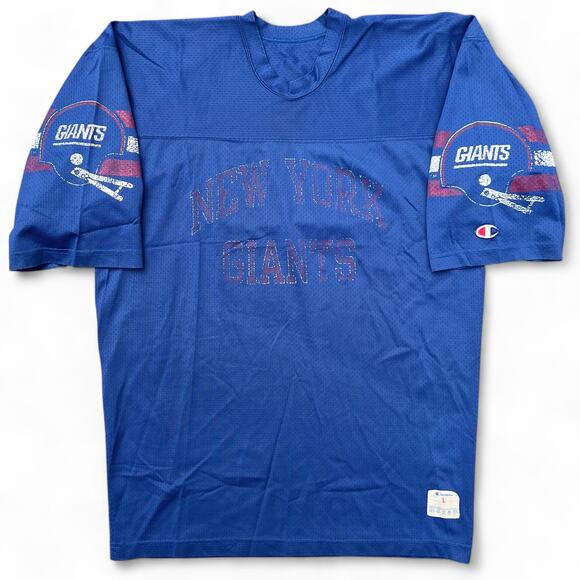 • True Vintage New York Giants 80s Champion Mesh Jersey with faded spellouts and helmet graphics on the chest and sleeves. Screenprinted letters, and logos. Vintage 80s, New York, NY, Giants, Sportswear, Streetwear, Football, NFL, Sports, Athletic vibes.