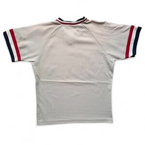 • True Vintage St Louis Cardinals Medalist Sand Knit Baseball Sports Jersey in light gray with red, white, and navy blue collar and sleeve cuffs. Perfect for everyday casual, sports, athletic, sportswear, streetwear, baseball, jock, 70s, 80s vibe.