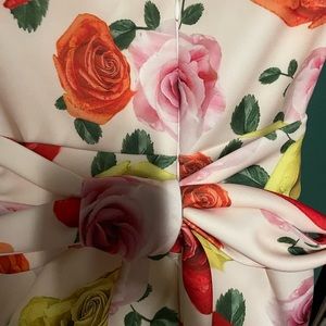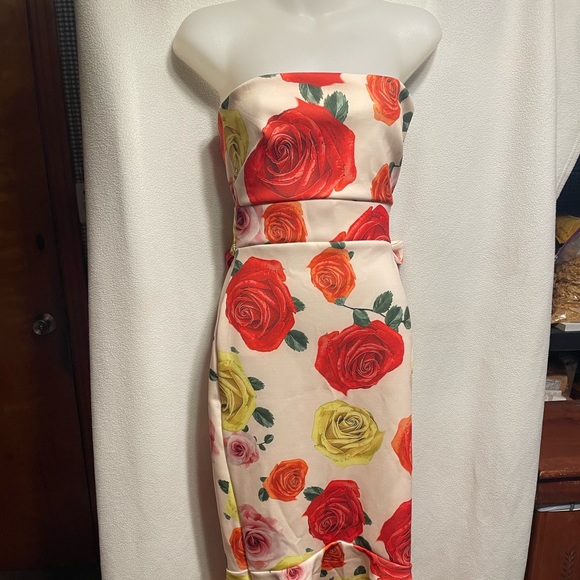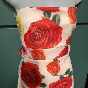 Beautiful thick material. Goes down like a mermaid dress strapless with a bow on the back