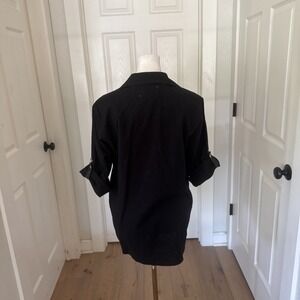 True Vtg CM Shapes Linen Black Floral Button Up Short Sleeve Tunic Top Blouse S