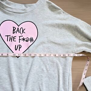 Light gray sweatshirt with a pink heart graphic. Bold black text inside the heart.