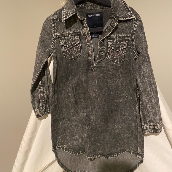 TR black acid wash denim dress with pink detail. Super cute size 2T. No flaws. Can fit 24 -2T