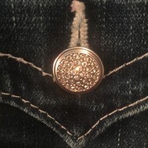 Dark wash skinny jean with pave crystal buttons on the back pockets and from pockets and front button. Great condition. Thin white stitching through out.