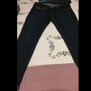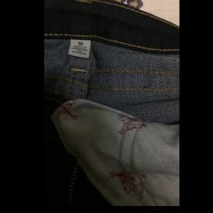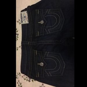 Dark true religion jean worn one. I am about 5'1 and they are just to long on me