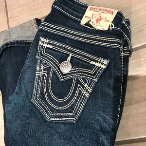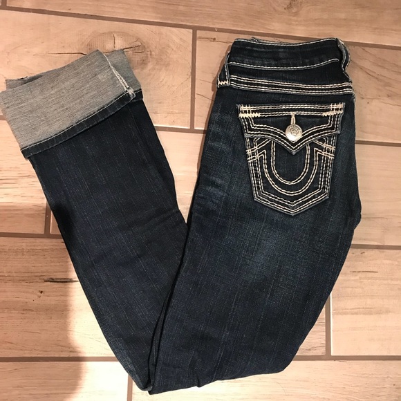 Dark wash true religion jeans worn only maybe 2 times. In the last picture you can see the tag is ripped a little only from the wash because it’s a paper like tag. Excellent condition! Straight leg that are cuffed because I was short but CAN be uncuffed! Shoot me an offer