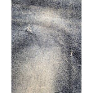 Light wear with a small frayed hole/abrasion on the front left thigh and minor scuffs consistent with distressed denim. Intentional fading and whiskering throughout. Zipper and button function properly; seams and hems intact.