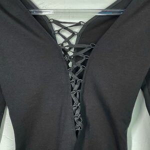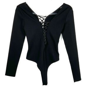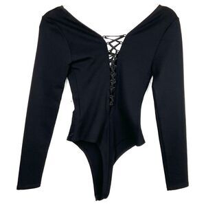 True Religion Black Double Lace Up Deep V Long Sleeve Bodysuit XS New