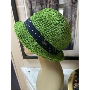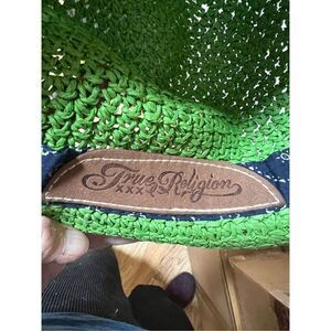From true religion, here is a bright green eye catching fedora with a blue band with a true religion logo plaque saying true religion 1956. This is made of 100% paper with a faux leather insert inside at the forehead .