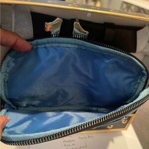 Denim belt bag by True Religion. Features rhinestone logo and adjustable strap.