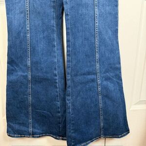 super flare legs, bib overalls, The Fey Jumpsuit is a day-to-night essential. This women's denim jumpsuit features a flare silhouette with a square neckline and backless design. Finished with classic gold stitching and a back zip closure. Dress it down with sneakers or up with heels. back pockets