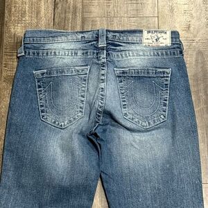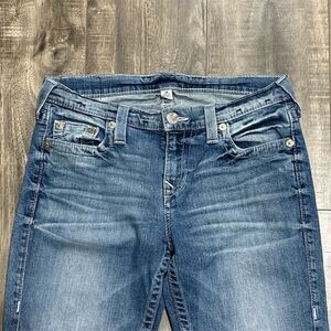 Keywords: True Religion, Boyfriend Jeans, relaxed fit, blue denim, mid-rise, iconic stitching, versatile, casual wear, women's jeans, 5-pocket design, medium wash, comfortable fit, pre-owned.