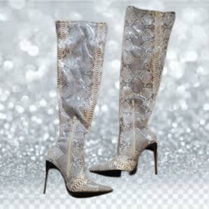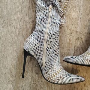 One of the things i bought and never wore. These are brand new. I tried on a couple times. The reptile feel authentic but its faux. These boots are amazing!! Size 38..narrow toe. Over the knee style