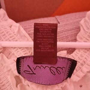 This is a lovely Trulli brand top in size L, in good condition. It features a delicate floral lace overlay in a soft, neutral shade, giving it an elegant and feminine touch. The top has a smocked neckline with a small keyhole tie detail, along with short ruffled sleeves for a charming look. Lightweight and breathable, it’s perfect for a casual yet stylish outfit.