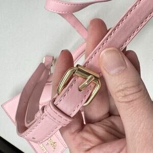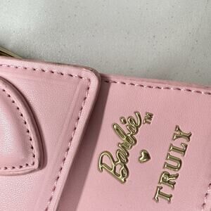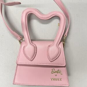 This is a Barbie collaboration mini purse from Truly Beauty x Barbie. The handbag is a pink crossbody bag with heart accents and a gold decal logo. It is a limited edition piece made of faux leather and features an adjustable cross-body strap.