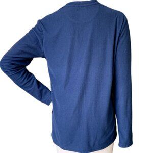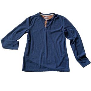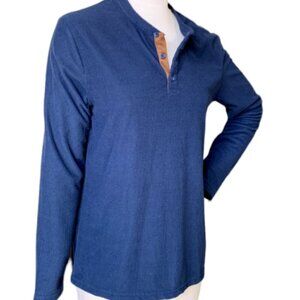 This is a Truly Slim Fit Henley Top in size M, featuring a collared neckline, long sleeves, and button closure. The top is made of a waffle knit fabric in a blue color, with contrasting trim and stretch for comfort. It has a unisex style with a classic, traditional look, suitable for casual occasions in the fall and winter seasons.