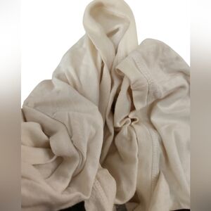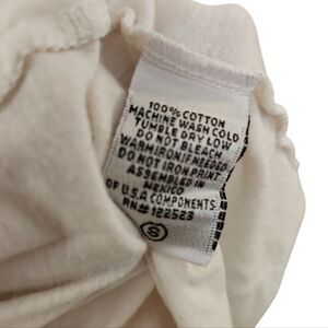 This is a 100% cotton tunic length tee in white with a large, southwestern Mative American graphic print on the front. This shirt is older and it has yellowed from age, but there are no stains or holes. It's soft, worn in - it just shows some wear. I did my best to capture the yellowing, but it's hard to see in the images - I didn't use any filters if that's helpful