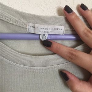 Simple, casual. Flowy, soft. In a tan/taupe color. Has a small defect at the bottom of Shirt but HARDLY noticeable. Purchased from UO.