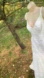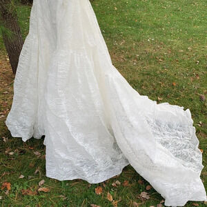 The skirt is fitted with a full puffy lace ball gown wrap around train surrounding it. It’s all attached and not removable. Zip up back with hook and eye closure. Soft white color