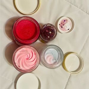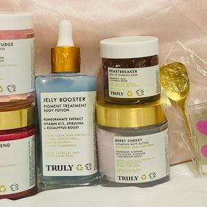 All items are brand new and never used! Truly mystery heart bag, mystery blue bag, key chain with key, Blue Razor, Unicorn Locks repair Hair mask, Smooth Legend pre-shave scrub, iCoco Rose Fudge whipped body butter, Jelly Booster Pigment Body Potion, Berry Cheeky clearing Butt butter (mini), Heartbreaker jelly Lip plumping Mask, Super Heart Acne Patches (18), Gold spatula