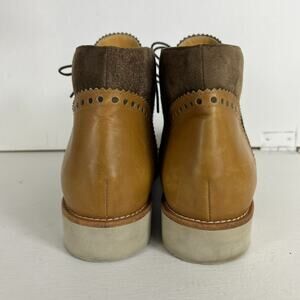 These Truman's Boots in Women's Size 39.5 are a stylish and versatile choice for any occasion. The super leggera design features a two-tone taupe soft suede and leather upper, with a lightweight and comfortable insole. The lace-up closure and ankle shaft style offer a secure fit, while the leather outsole provides durability. Whether you're traveling, attending a wedding, party, or formal event, these boots are a fashionable and practical option for any season. Made in Italy, these boots from Trumans are sure to make a statement with their unique design and quality craftsmanship.
