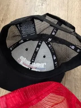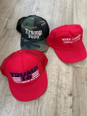 Three political trucker caps. One camouflage front with black mesh and white "Trump 2020" embroidery. Two solid red caps with white and blue text graphics. Classic curved brims and mesh backing. Great for collectors or rallies.