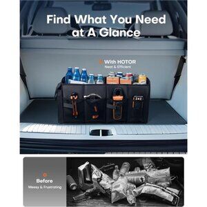 🧿CONVENIENT ACCESS: HOTOR car trunk organizer for SUV is equipped with 2 compartments and 6 stretchy mesh pockets to make items easy to see and grab when needed. No more digging around a messy trunk to find what you need. Just grab and go.
