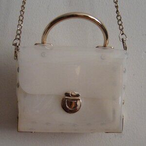Trendy trunk style with gold metal top handle & crossbody strap.