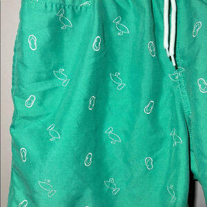 Dive into style with these vibrant green swim shorts with pelicans and sandals embroidered. Perfect for a day at the beach or pool.