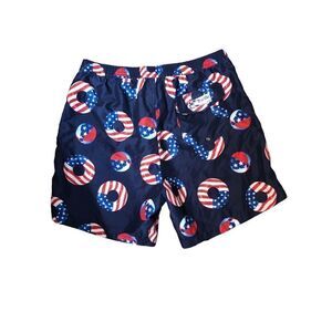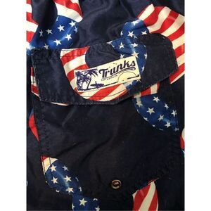 Trunks Surf and Swim Co. Swami American Flag Print Swim Shorts. Elastic back waistband. Stretches about 3” more than measurements in photos. Mesh lining has been cut out from inside. Front and back pockets. Swim tubes red white and blue. Excellent condition besides cut out inside.