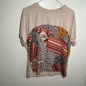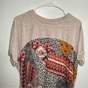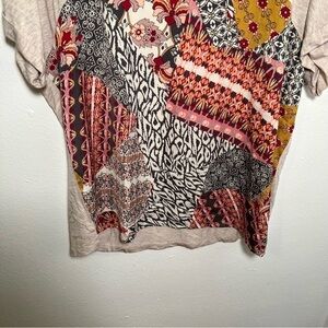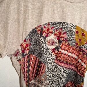 Great condition. Truself. Mixed media blouse. Crewneck. Short sleeve. Top and back are solid beige. Front is gray, white, red, pink, and orange geometric floral pattern. Style 08NG-ESPO. size large. Stretch 97% rayon, 3% spandex. Pit to pit laying flat 22.5” Pit to hem 25” Sleeve (pit to hem) 3”. All measurements are approximate and taken lying flat. Smoke free home. No trades, offers welcome.