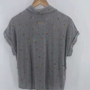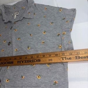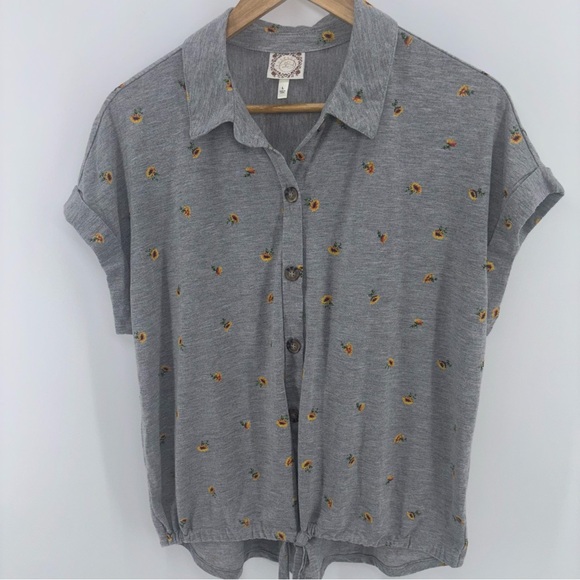 Truself Women L Sunflower Print Button Front Short Sleeve Grey Top Classic Soft