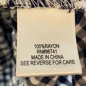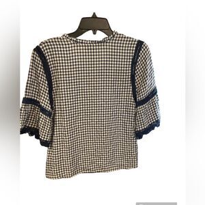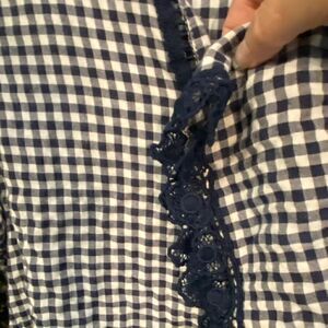 Blue and white checkered print with blue embroidery on the sleeves and at the chest line.