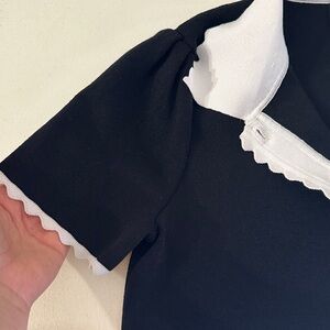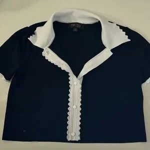 Chic cardigan with scalloped trim. Short sleeves and button front.