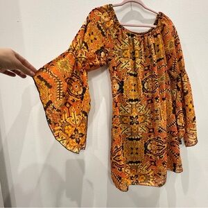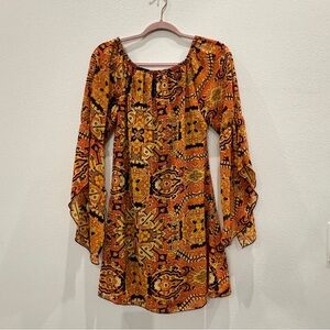 Vibrant bohemian dress with intricate patterns. Features long sleeves and a relaxed fit. Perfect for casual outings. Comes from dog friendly home.