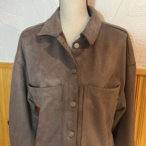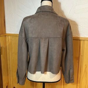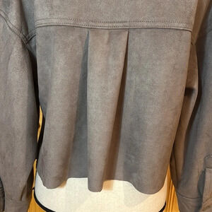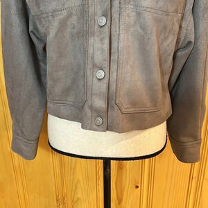 Faux suede short jacket with a lapel collar, long sleeves, large front pockets and a button up closure. In excellent like new condition. No stains or holes. Approximate measurements laying flat: bust 20” across from armpit to armpit, sleeve length 19” and length 19”.