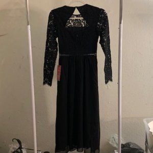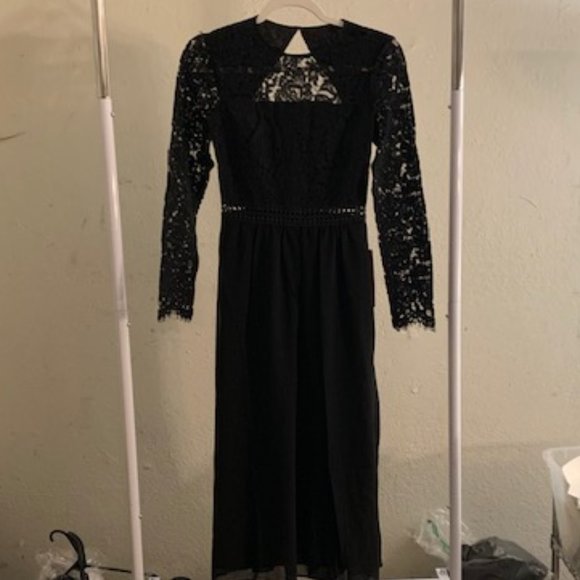 This is a new in manufacturers original plastic bag Women's Black Sheer Lacy Long Sleeve Triangle Back Cut Out Midi Dress in size XXS made by Truth & Fable. It has a retail value of $80.