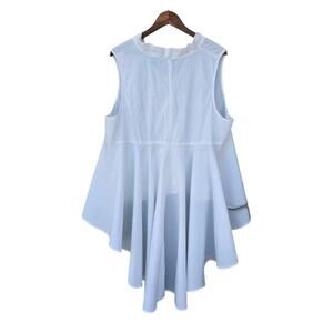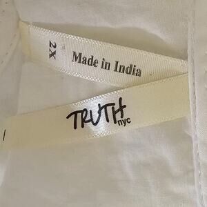 Truth NYC Tie Neck High-Low Blouse in White. Size 2X. Features tie V-neck, sleeveless, and high low hem. 100% Cotton. Excellent pre-owned condition, no flaws.