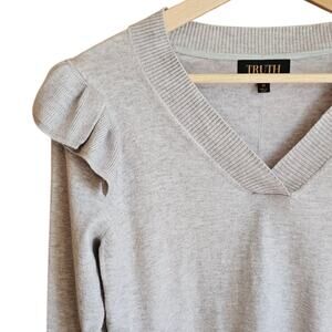 Truth Republic Women's Sweater VNeck Ruffles on Shoulders Grey Medium