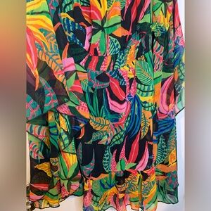 Wide ballon sleeves. Elastic waist and elbow. Length 34” in. Ruffles top. Sheer back with the front having cover, lining. Prefect.