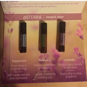 Bundle deal - Sample Trio contains Peppermint: Add to water and mist when overheated. Melaleuca: Use with shampoo for healthy scalp. Lavender: Apply a drop to pillow at bedtime. Sample Blend Trio contains Breathe: Apply to chest for seasonal discomfort. On Guard: Diffuse for added immune support. DigestZen: Diffuse to soothe motion sickness. Hit the "Buy Now" button to receive freebies with your order! Please note reasonable offers excepted but no freebies included. Thank you!