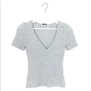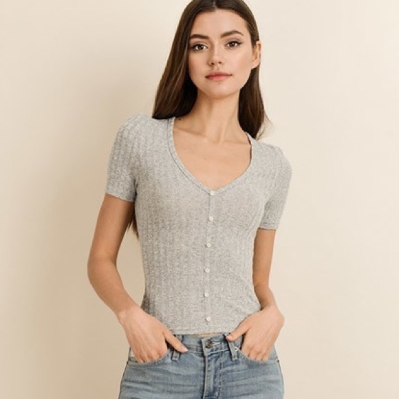 Lightweight knit top featuring scoop v-neck and form fitting material. Super flattering with high waisted shorts or skinny jeans.