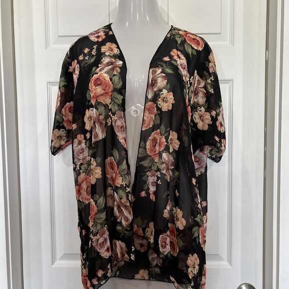 * Try! This Women's S Kimono Blouse Black & Pink Floral Semi Sheer Cardigan