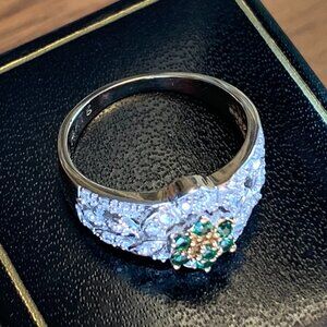 This gorgeous ring is one I had purchased in the early 2000's and never got around to selling or sizing for myself, so it is new old stock. The metal is 14k gold. The stones are green Tsavorite garnet (7 round cut) and a bunch of little diamonds. It is a very pretty ring with a vintage look and in new condition. The band is about 2mm in the back and 11mm in front.