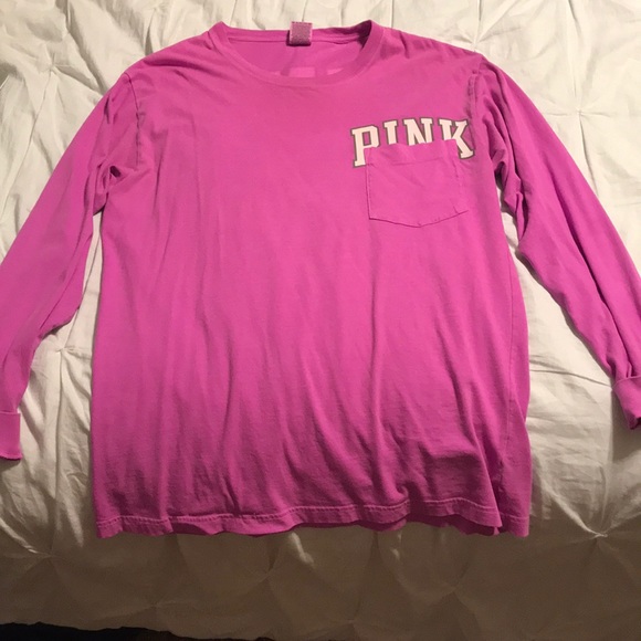 Purplish pink t shirt with white writing with a grey border around the letters