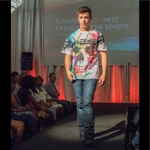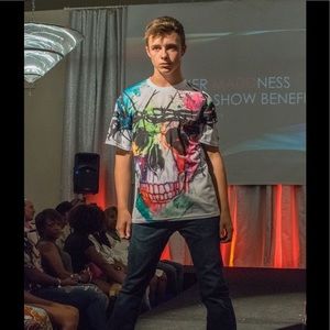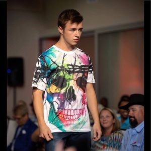 100% Polyester Skull Design. Thicker material than most T-shirts. Short Sleeved Pullover. Green, Red, Blue, Rose, Black & White. Sample Sale: We are clearing out our samples and getting ready for new inventory. New Merchandise - Worn only by Model for pics and/or Fashion Show.