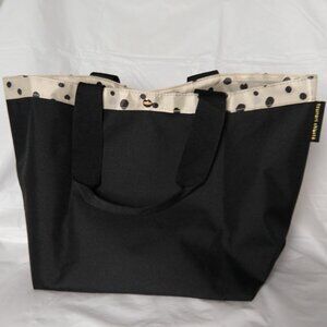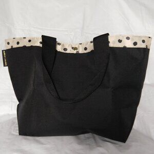 Stylish Tsumori Chisato black poly canvas tote with 5 pockets and D-ring on the inside to organize all your belongings. Lined along the top and on the inside with the designer's signature cat dot print fabric. Height 11", 17.75" along top, 11.75" along the bottom. About 6 " wide at base. Height including handles 19". Foldable. Never used.